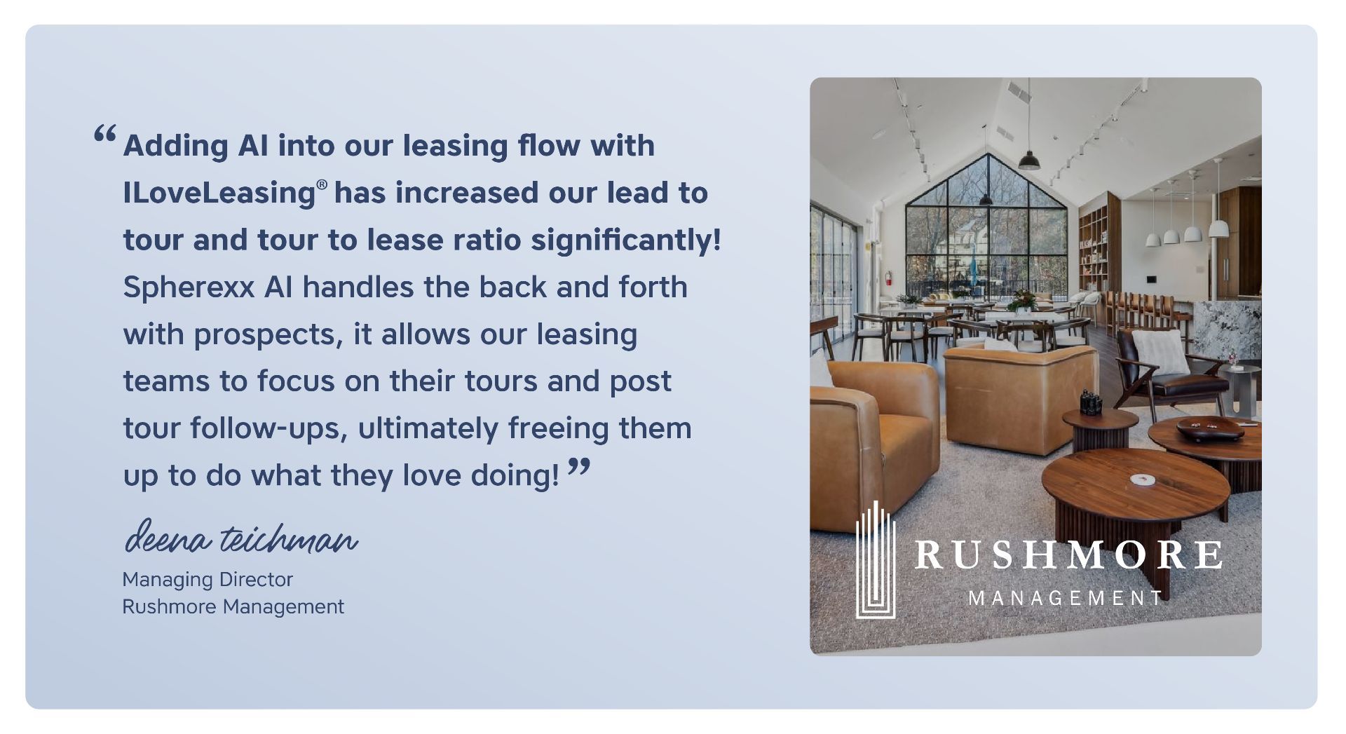 Convert leads to leases more effectively, save valuable time, and serve clients better using multifamily's most trusted CRM platform. The ILoveLeasing® smart hub is designed to organize your day and engage leads using the power of robust automation and personalized AI interaction. It's easy-to-use for small leasing offices yet powerful enough to scale for all types of centralized leasing office configurations.