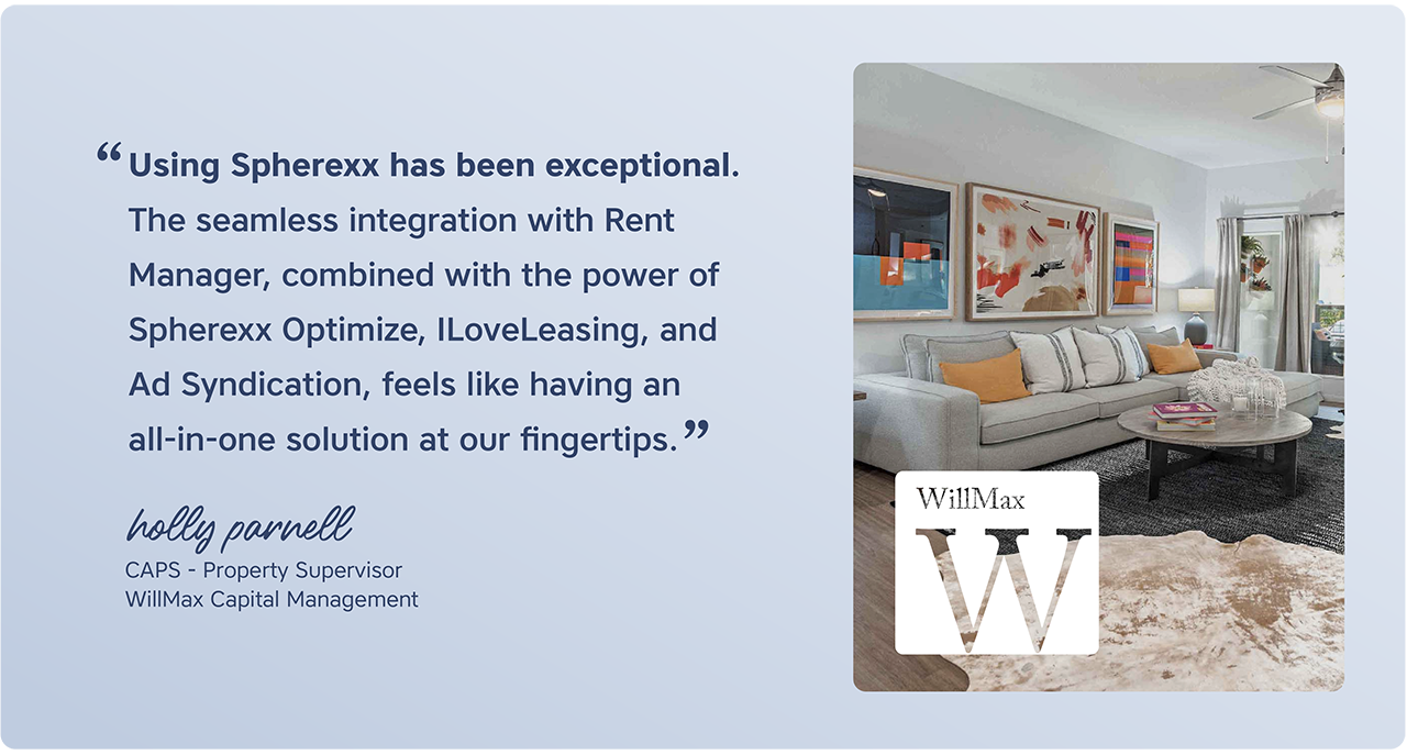 Pair with other solutions from the Spherexx decision integration network as well as the industry's most popular property management software. Don't see your software listed? Chat with us about custom integration options.