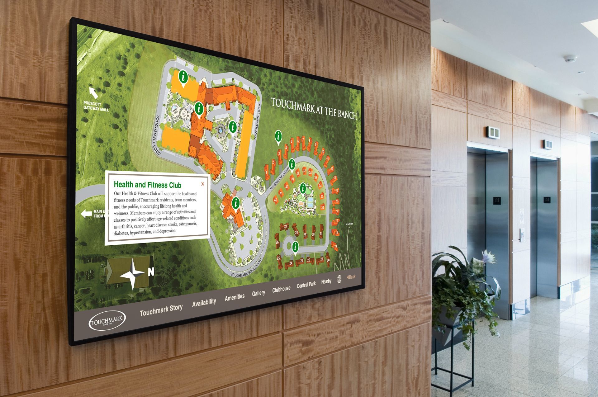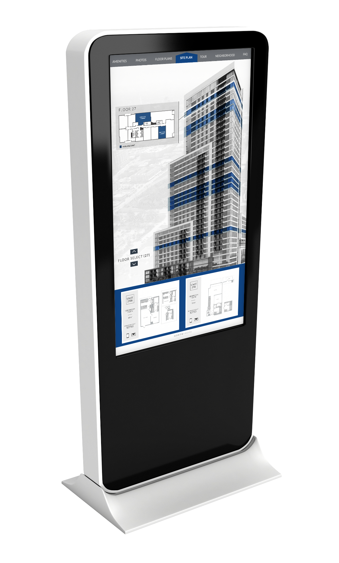 Custom built touchscreen kiosks professionally designed with 2D & 3D graphics and animations, detailed floor plans, video tours, and integrated maps to show off the property's local attractions & services.