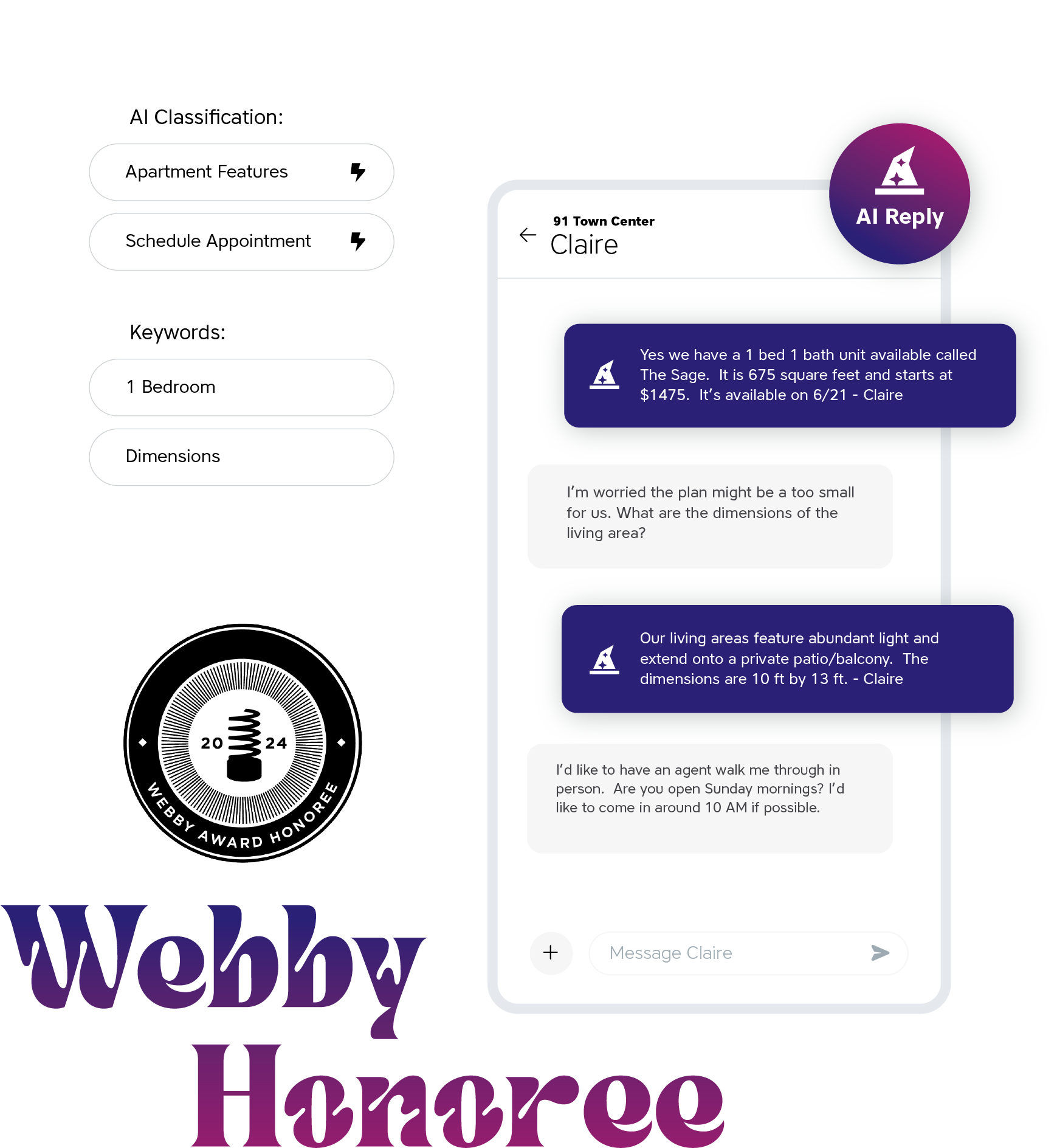 Every interaction is tailored to the apartment shopper while being tracked and noted in the CRM so you can step into the lead process whenever you want.