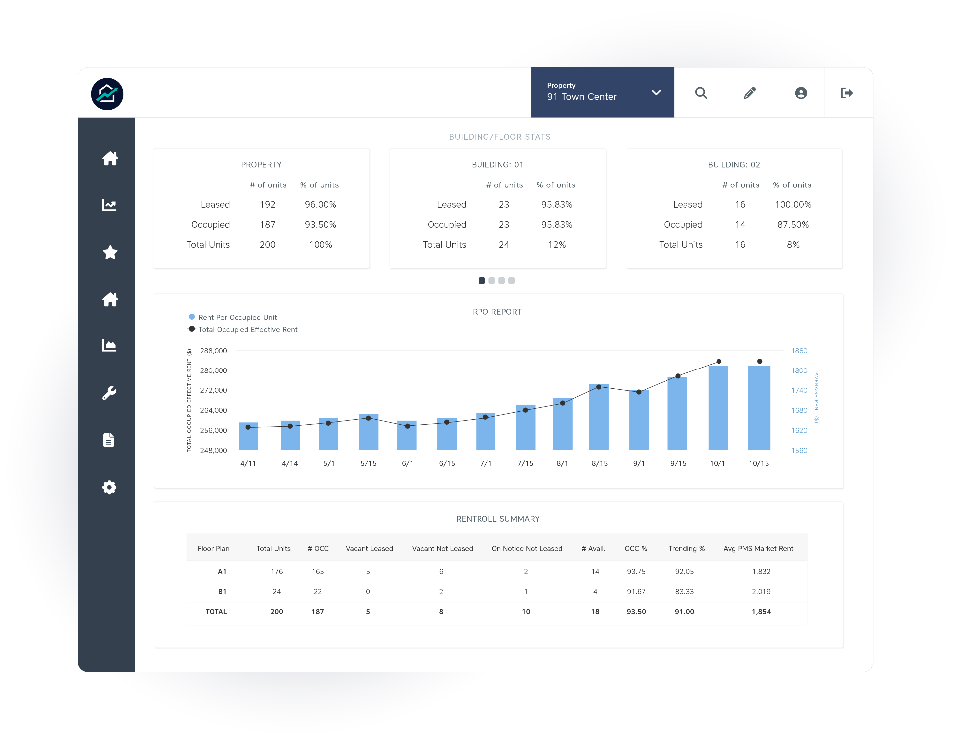 The Visual Rent Roll provides a unique view of your asset. It includes summary data as well as easy drill down to specific unit history.
