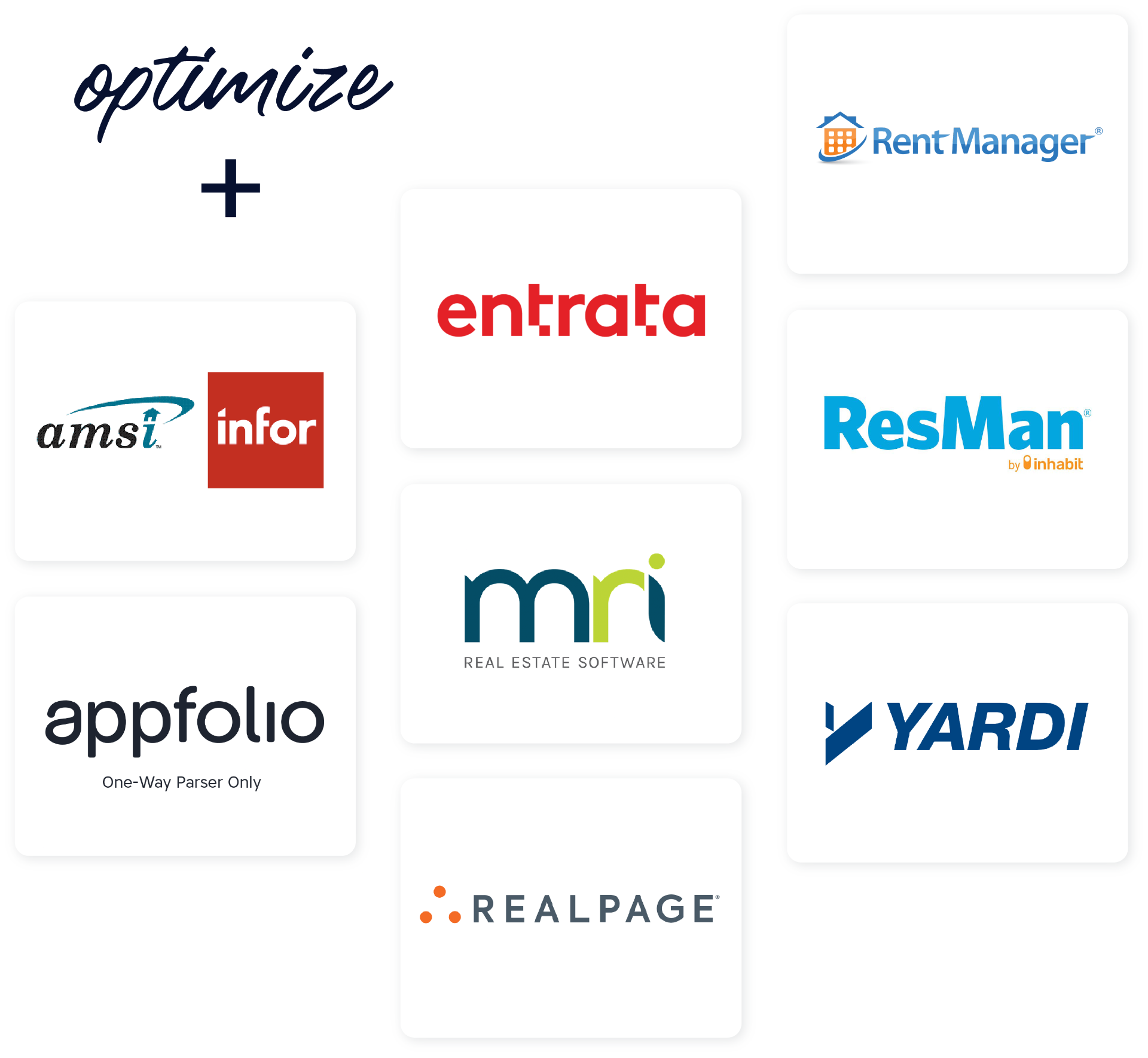 Optimize integrates with all the top property management software including AMSI/Infor, Entrata®, MRI, RealPage®, Rent Manager®, Resman®, Yardi and Appfolio (parsing only). Don't see your software listed? Chat with us about custom integration options.